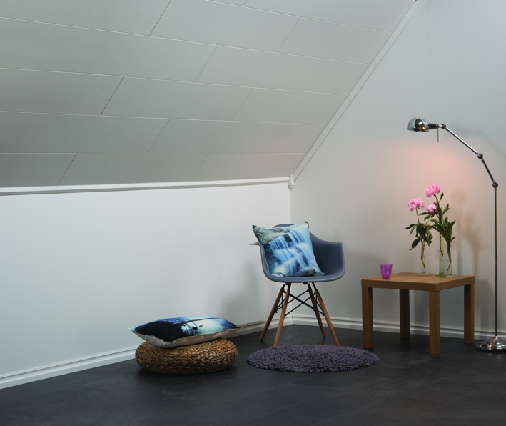 Huntonit prepainted ceiling consists of the same material as the Huntonit wall panel. Down lights may be installed in all our ceiling panels. Huntonit ceiling is adapted for mounting in both dry and wetrooms provided that the ceiling height is normal and the ventilation is good.
